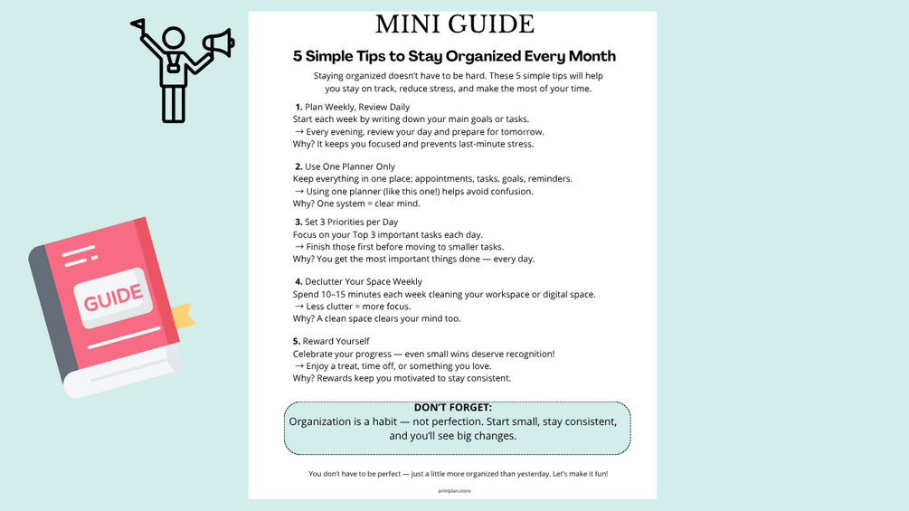 1x Mini Guide: 5 Simple Tips to Stay Organized → Quick, practical tips to boost your productivity